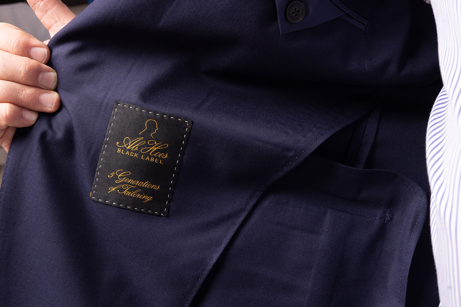 In 2019 lanceerden wij Black Label. Dit is onze eigen premium maatpakkenlijn die werd ontwikkeld als ode aan Ab Hoes, onze vader en opa. Het idee was eenvoudig: een pak maken zoals het volgens traditioneel vakmanschap hoort, maar wel met een hedendaags sausje.