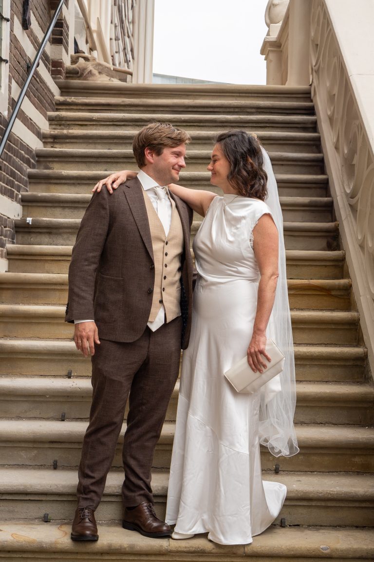 Omdat de partner van Maurits niet heel erg van verrassingen houdt en een sterke voorkeur heeft voor wat ze wel en niet mooi vindt, besloot hij haar mee te nemen naar de winkel. “Het was erg leuk om met z’n tweeën keuzes te maken met betrekking tot het pak. Van de helft van de mogelijke opties wist ik niet eens dat ze bestonden” vertelt Maurits. Hij vond het heerlijk om de tijd te nemen om een pak te laten maken. Van de grote lijnen als de vorm en kleur tot aan de fijnste details als de knopen en de vorm van de zakken. Bij de eerste keer passen was het wat onwennig maar vond hij het er al prachtig uitzien. “Nu we de foto’s van de bruiloft hebben ben ik heel erg blij dat ik zo’n mooi pak heb laten maken bij Hoes Tailors” legt Maurits uit.