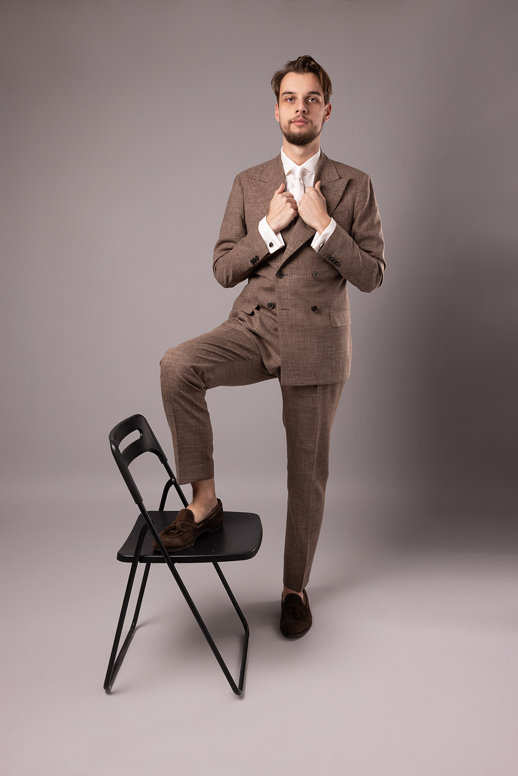 Voor deze collectie werken we met stoffen van topkwaliteit. Dit doen we in samenwerking met het Portugese stoffenhuis Paulo de Oliveira. Wol vormt de basis van deze stof, gecombineerd met polyester, linnen en een beetje elastan. Het resultaat is een stof die ademt, vormvast blijft en lekker zit. Zelfs tijdens dagen waar geen eind aan lijkt te komen.