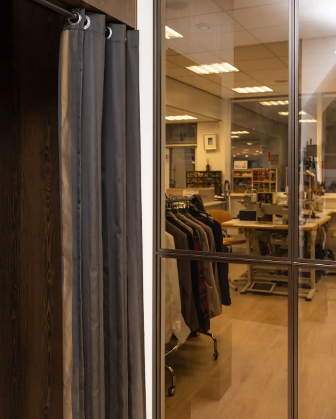 Wij gaan in ons atelier aan de slag met de laatste aanpassingen aan jouw pak. We zorgen er voor dat hij tot in de puntjes goed past.